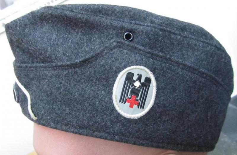 Attractive, typical darker-greyish-blue-coloured, so-called: German Red Cross (ie. 'Deutsches Rotes Kreuz' or: 'DRK' EM- (ie. NCO-) type side-cap (ie. 'Schiffchenmütze für Mannschaften u. Unteroffiziere des deutschen Rotes Kreuzes')