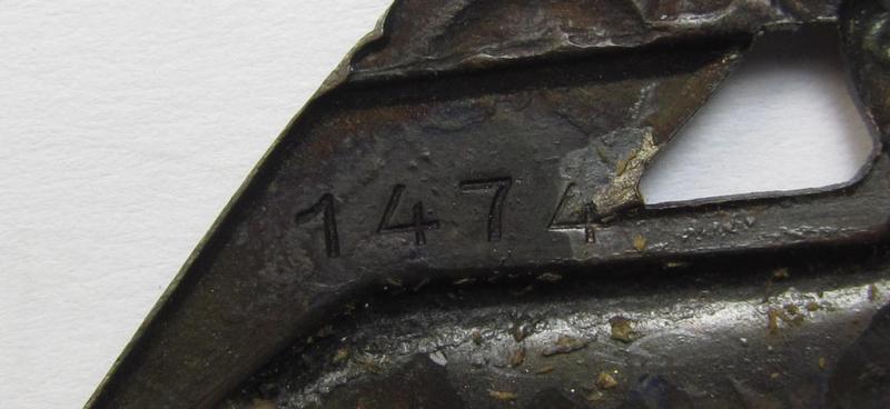 This is a very attractive - and truly rarely encountered! - example of a (male-type) NJS- (or: 'Nationale Jeugdstorm'-) related youth-sports-badge of the bronze-class (or: in Dutch language: 'NJS-Sportdraagteken voor jongens in brons') being an attractive example that shows a unique, engraved serial-number (that reads: '1474') on its back being a nicely preserved example that comes in an overall very nicely preserved- (and I deem only moderately used- ie. worn-), condition. The attractive piece - which is executed in (bright) bronze-toned metal (ie. 'Buntmetall') - shows an upright-positioned arrow-illustration upon which the flying sea-gull-device can be noticed (as can be seen on the pictures). The piece is very nicely preserved and shows a fully preserved bronze-toned surface without showing any defaults: it comes naturally mounted onto its fully functional and unaltered (typically shaped!) pin- ie. pin/catch-set-up. Simply a very attractive - and truly rarely found! - NJS- (or: 'Nationale Jeugdstorm'-) related 'NJS-Sportdraagteken voor jongens in brons' that is with certainty accordingly priced: only the first such neat male NJS-item in this bronze class I ever had on offer!