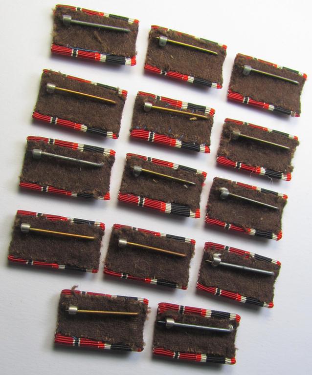 I recently uncovered a small stack of two-pieced, (genuine) WWII-period ribbon-bars (ie. 'Feld- o. Bandspangen') that each depict the combination: 'Kriegsverdienstkreuz der II. Klasse mit Schwertern' (or: war merits'-cross second class with swords having a bronze-toned swords-device attached) and an: 'Ost'-medal (ie. 'Medaille Winterschlacht im Osten 1941-42') and that come all in an overall very nice- (and simply never issued- nor worn-), condition. The pieces - which originated from the 'left-overs' of an old tailor-shop - are 'standard-issue'-pattern, two-pieced ribbon-bars (ie. 'Feld- o. Bandspangen') of which both bars are of the smaller (ie. regular 1,5 cm. wide-sized-) version: all pieces measure thus 3 cms. in length. The pieces are all neatly 'backed' with a piece of darker-brown-coloured wool as to be expected. The bars come in an overall nice condition and are naturally fully functional: they just show some minimal storage-age ie. staining (as can be seen on the pictures). My asking-price is naturally intended per single 'Feld- o. Bandspange'. Please do note that this item does not show 'reserved' before the last item has been sold. Simply a nice opportunity to acquire a neat 2-pieced ribbon-bar that can be used for almost every TR-tunic!