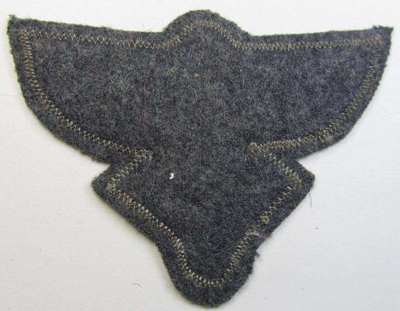 This is a very attractive - and actually not that easily found! - example of a bluish-grey-coloured, so-called: N.S.F.K.- (or: 'National Socialistisches Flieger Korps') breast-eagle ('Armadler für Mannschaften u. Unteroffiziere des N.S.F.K.') being a nicely ('BeVo'-) woven- (and enlisted-mens'- ie. NCO-pattern) example depicting the 'Fliegender Mensch'-symbol that comes (pre)mounted on its piece of bluish-coloured wool and that comes in an overall very nice- (ie. moderately used- ie. once shirt- ie. tunic-attached-), condition. The breast-eagle - which is neatly woven in the so-called: 'BeVo'-like weave-technique - comes (off-factory) mounted on its bluish-coloured- and/or woolen based backing but misses an 'RzM'-etiket (as can be seen on the pictures). The piece was minimally used ie. presumably once tunic-(ie. shirt-) attached and does show some minimal signs of having been worn and used as such (as can be seen on the pictures). Simply an attractive EM- ie. NCO-pattern example that was specifically intended for usage on the bluish-coloured: 'N.S.F.K.-Dienstblusen' (ie. shirts or tunics)!