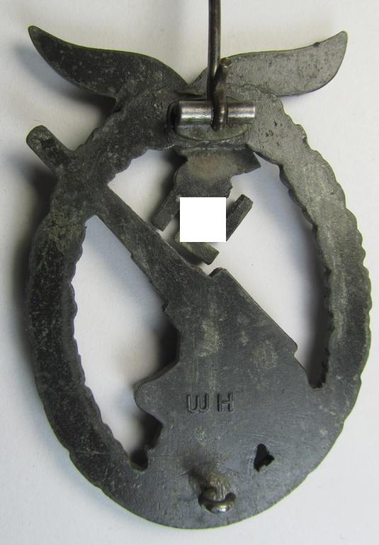 Later-war period- and/or: zinc- (ie. 'Feinzink'-) based- example of a maker- (ie. 'WH'-) marked, WH (Luftwaffe) 'Flakkampfabzeichen' (or: airforce anti-aircraft badge), as was produced by the desirable: 'Wilhelm Hobacher'-company