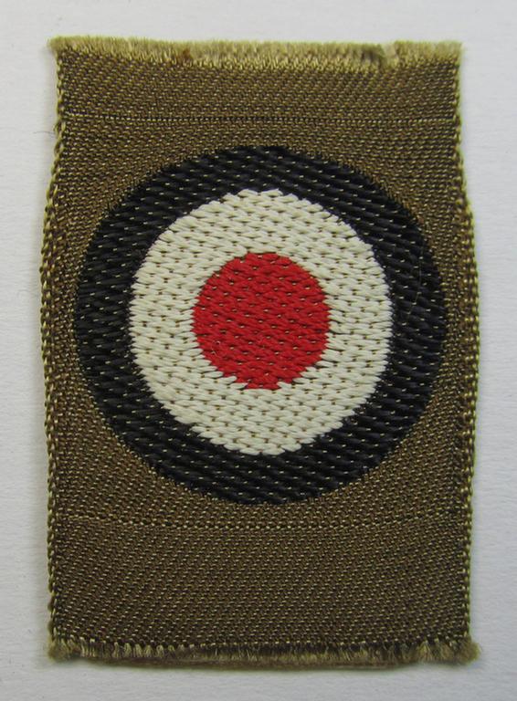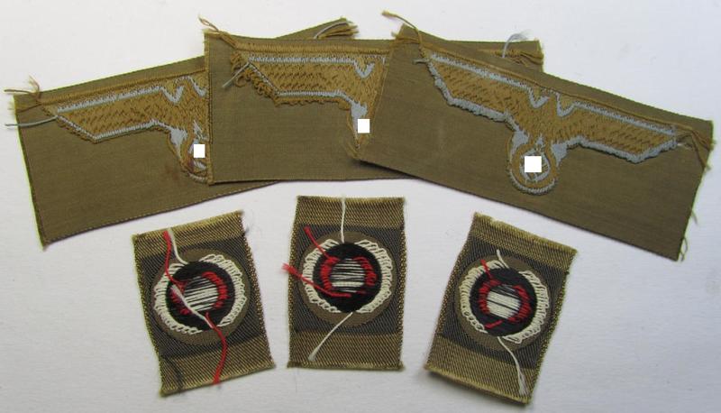 I recently uncovered three - fully identical and with certainty rarely found! - fully matching WH (Heeres ie. 'tropical-issue'-) cap-eagle and cocarde-sets (ie. 'Tropen Schiffchen-Adler u. Kokardensätze für Mannschaften u. Unteroffizier des Heeres') being all three 'virtually mint- ie. unissued' sets as executed in bluish-grey-coloured linnen on a (typical) tan-brownish-coloured background and that come all three in an overall very nice- (ie. simply never issued- not used- ie. 'virtually mint- ie. unissued'-, condition. The sets are executed in bluish-grey-coloured linnen on a light-brown- (ie. tan-) coloured (and also linnen-based) background and are typical examples of the fantastic 'BeVo-weave'-technique used in the days. All three sets have naturally never been trimmed- nor pre-folded and do just show some slight staining, simply caused by decades of storage only (all three eagles show a tiny hole on the left-side of the eagle-wing-tip as can be seen on the pictures. The sets come as 'straightly cut-of the role' and can naturally easily serve to restore or complete any tropical side-cap ie. 'Schiffchen' (or even M41/43 tropical field-cap. It should be noted that especially the tropical-cocardes (being of the second pattern) are almost impossible to encounter). My asking-price is naturally intended for a single set. Simply a nice occasion to acquire a neat and rarely found replacement tropical side-cap-eagle/cocarde-set for a competitive price!