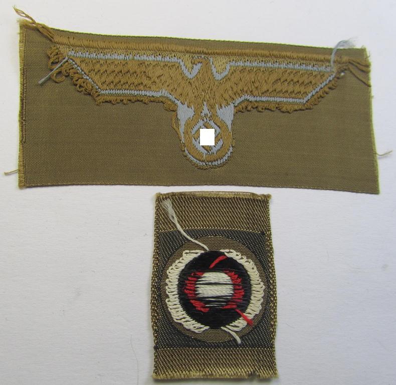 Superb - and rarely encountered! - WH (Heeres ie. 'tropical-issue'-) cap-eagle and cocarde-set (being a 'virtually mint- ie. unissued' set as executed in bluish-grey-coloured linnen on a tan-brownish-coloured background)