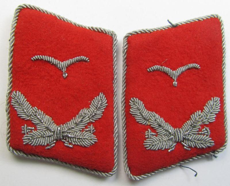 The attractive - fully matching and carefully tunic-removed! - 4-pieced insignia-set was with certainty always together and was recently found together as such. The neatly cyphered shoulderboards - which are constructed from the bright-red- (ie. 'hochroter'-) coloured and/or: 'smooth-type' (ie. moleskin-like-) wool - come in an excellent condition overall and are truly hard to be upgraded. The set has somewhat shiny, bright silver-coloured 'upperdecks' as to be expected for a true LW-pair. The boards are just a bit 'tarnished' ie. stained by normal age. The boards - which measure approximately 11,5 cms. in length each - show two matching sets of (bright-golden-toned- and smaller-sized) '2'- and '6'-numerals (ie. 'cyphers') period-attached, denoting the junior officers'-rank of: 'Leutnant' (ie. lieutnant). The boards never had any tongues and were clearly used as a pair of the 'sew-in'-pattern (as can be seen on the pictures). The boards came with an equally nicely preserved (and also minimally worn- ie. also once tunic-attached) pair of neatly hand-embroidered, officers'-type collar-patches (ie. 'Kragenspiegel für Offiziere der Luftwaffe') which are also piped in the bright-red-coloured branchcolour. The silver-toned hand-embroidery - which is executed on a bright-red-coloured- and/or typical 'smooth woolen'-based background as to be expected - shows some truly minimal staining and/or storage-age (as can be seen on the pictures). The set is neatly 'backed' with beige-coloured, buckram-based material as is more often encountered. This interesting 4-pieced, LW insignia-grouping belonged to a: 'Leutnant u. Mitglied des 26. Flakdivisions' who was issued this set, used it and then stored it as such for decades. Simply an attractive 'Flak-Artillerie'-related insignia-grouping that will be very hard to be upgraded!