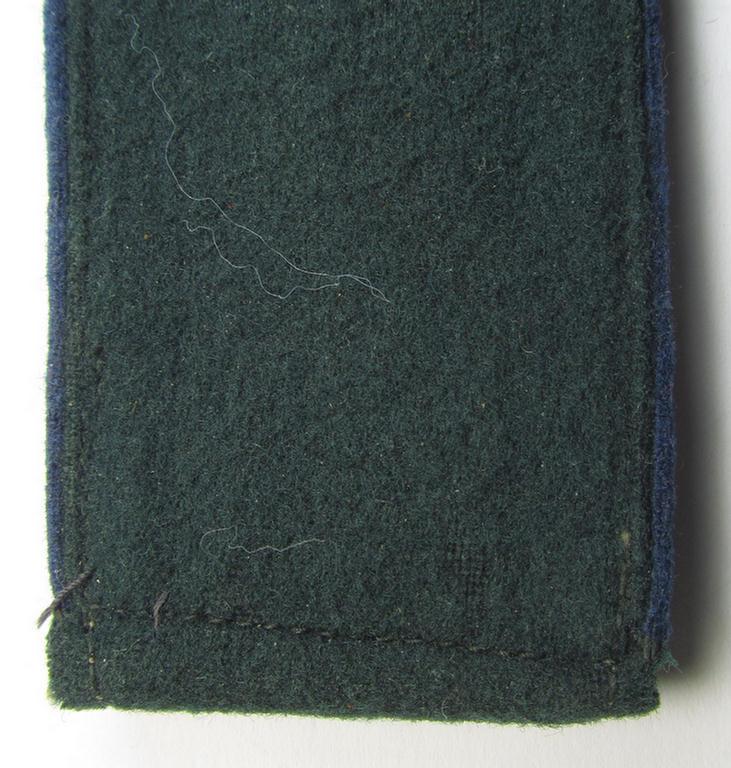 This is a neat - albeit regrettably single! - early- (ie. pre-) war-period- (ie. 'M36 o. 40'-pattern-) WH (Heeres) enlisted-mens'-type shoulderstrap as was piped in the blue- (ie. 'blauer'-) coloured branchcolour as was intended for usage by a: 'Soldat der Sanitäts-Truppen' (or: simple soldier ie. medical-orderly who served within the army medical-troops) and that comes in an overall nice- (albeit clearly used- ie. worn-), condition. The shoulderstrap - which measures approximately 12,2 cms. in length as more often seen - has the woolen-type piping attached (as is more encountered). The shoulderstrap - which originates from a larger cloth- and insignia-collection I recently acquired - comes mounted onto its functional tongue and does shows some regular age, wear and/or staining. Simply an attractive - and/or fully 'text-book'! - 'M36 o. 40'-pattern-)EM-type 'Sanitäts'-related shoulderstrap that was intended for usage by a: 'Soldat der Sanitäts-Truppen'!