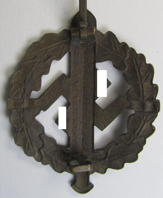 Early- (ie. pre-) war-period 'SA Sportabzeichen in Bronze' being a nicely maker- (ie. 'E. Schneider'-) marked example that bears a unique, stamped bearers'-number that reads: '379862' on its back