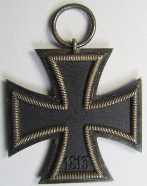 The attractive set - which was most certainly issued but that was simply never worn nor mounted - came together with its pre-folded- and/or non-confectioned (and approx. 29 cms. long-sized) ribbon (ie. 'Bandabschnitt') and typical, (light)blue-coloured- and 'Zellstoff'-based pouch as issued and stored for decades. The cross - which is totally void of a makers'-designation as more often - was with certainty never cleaned and has a nice and attractive age-patina: it has, however, lost most its so-called: 'hochpolierte Kanten' (or: polished sides) and has a somewhat darkened- ie. tarnished finish (as can be seen on the pictures). The cross has a nicely preserved, black-finished (ie. somewhat 'satin-like'- ie. 'matted-style'-) core: it is void of any paint-damage (as can be seen on the pictures). The piece is just a tiny bit dusty and/or stained but was never cleaned nor polished. I deem that the cross is an evident specimen that was produced by the maker: 'F. Zimmermann' (ie. 'Hersteller 6') as was based in the town of Stuttgart and has nice and/or pronounced detail as to be expected for a cross by this desirable maker. The IC-set was recently found at a German private-household and was truly never before in collectors'-hands. Simply an attractive - and complete! - 'EK II. Klasse'-set as was produced by the: 'Fritz Zimmermann' -company and that will be hard to be upgraded!