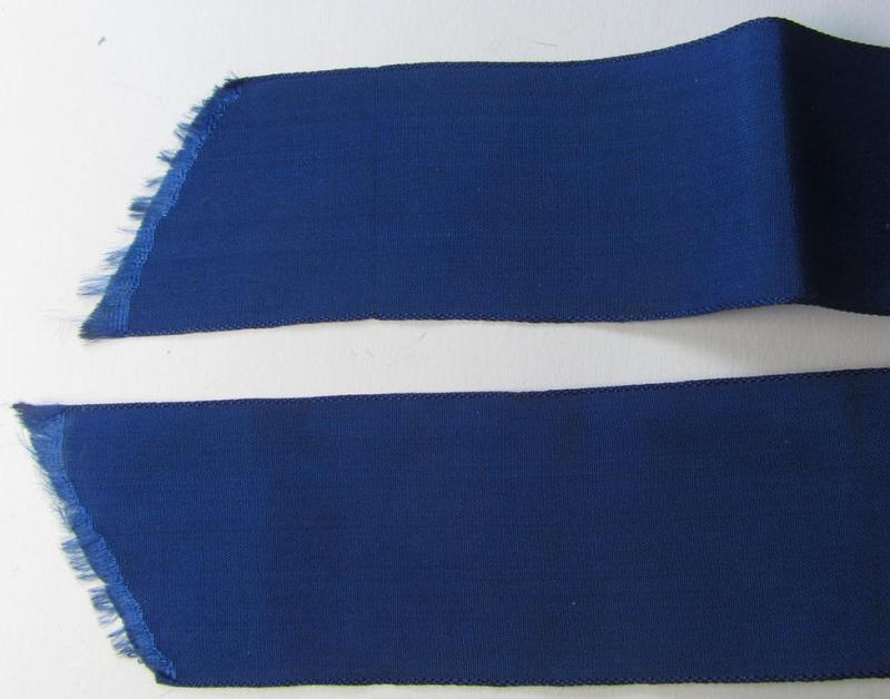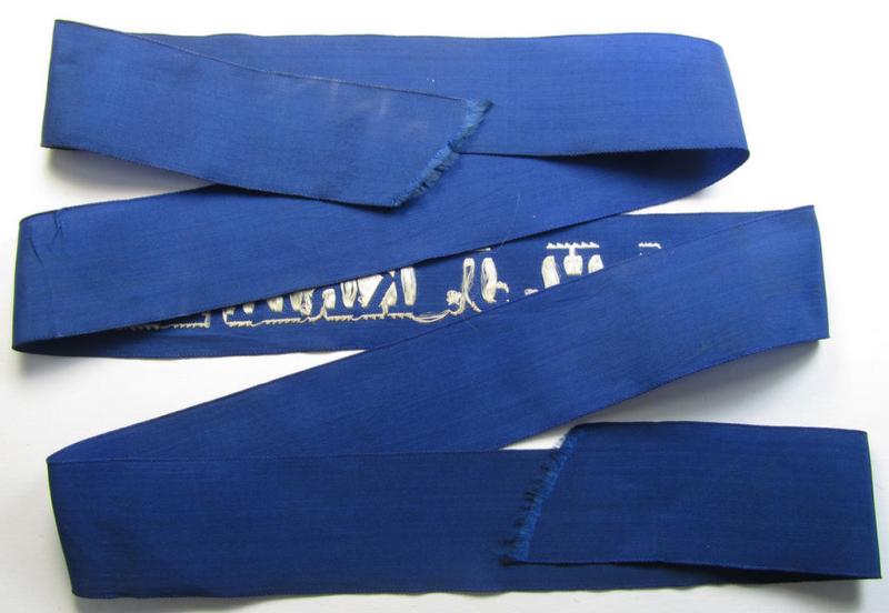 This is a very attractive - and with certainty very rarely encountered! - Marine-HJ (ie. 'Marine-Hitlerjugend') so-called: cap-tally (ie. 'Mützenband') entitled: 'M.H.J. Krefeld' being a full-length example that comes in an overall very nice- (ie. just moderately used- and/or most certainly worn-), condition. The cap-tally - which is woven in silverish-white-coloured linnen on a cornflower-blue-coloured background comes in a full-length condition and measures approximately 118 cms. in length. The piece is neatly excecuted in so-called: 'BeVo'-like weave-pattern - and is as stated woven in (bright!) silver-white-coloured (ie. almost 'flat-wire'-like!) thread (as can be seen on the pictures). It does shows some (minimal) age, wear and/or staining but is totally void of any real damage or alike. This example originated from a private-household in Germany and and once belonged a Marine-HJ-member who wore it and afterwards stored it for decades. I deem that this attractive and desirable Marine-HJ example is accordingly priced!