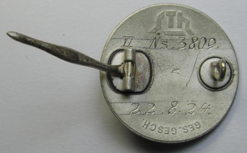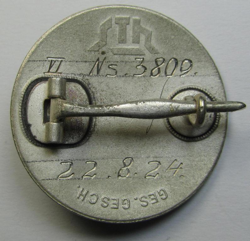 This is an attractive example of a neatly bright-silver- (ie. 'Buntmetall'-) based and/or enamelled lapel-pin (aka: 'Eintrittsabzeichen') that was worn by a member of the organisation: 'Der Stahlhelm' - Bund der Frontsoldaten (Sta)' being an example that was issued in the year: '1924' and that comes in an overall nice and/or fully undamaged- and untouched, condition. The badge on offer here is a so-called: 'Eintrittsabzeichen 1924' (or 'entry-badge') which is nicely engraved and/or dated: '22.8.24' on its back (as can be seen on the pictures). The badge - which truly shows no enamel damage whatsoever - has I deem never been cleaned nor polished and still retains a nice and minimally darkened- (ie. tarnished) age-patina. It is also neatly maker-marked with a logo ('STH') and bears the usual 'Ges.Gesch.'-patent-pending mark as is more often encountered on these attractive SH-membership-badges. Of additional interest is, moreover, the fact that this example also bears the engraved name- ie. unit that reads: 'VI. Ns. 3809'. The lapel-pin comes naturally also mounted onto its functional pin- ie. catch(-set-up). A similar example is also figured in the 'Heering-Hüsken'-lapel-pin catalogue, wherein it is given a unique reference-number (4107N) and an estimated value of 140 Eu. I deem this is an attractive and most certainly decorative badge which I have priced according to its fully untouched and minimally tarnished condition!
