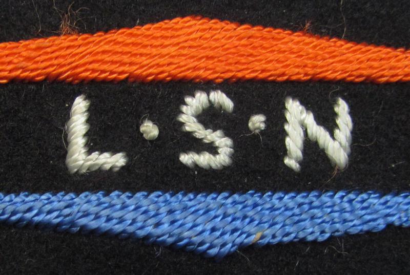 This is a very attractive - and with certainty Dutch-produced - example of the with certainty rarely encountered, neatly hand-embroidered (and most certainly later-war-pattern!) arm-badge (ie. arm-shield) as was intended for members serving within the: 'SS-Frw.Brig.' “Landstorm Nederland“ and that comes in an overall very nice- (and/or I deem possibly issued- albeit never worn- ie. 'virtually mint'-), condition. The neat patch - which approximately measures 8 x 4 cms. - comes mounted onto a black-coloured- and/or woolen-based 'backing' (which is nicely covered by beige-toned paper) whereupon a bright-orange- and blue-coloured 'triangular'-symbol is embroidered that shows in its centre the (also hand-embroidred!) characters ie. text: 'L.S.N.' (being the abbreviation of the Dutch Waffen-SS divisional name: “Landstorm Nederland“ (as can be seen on the pictures). There is not much nown regarding these interesting badges: they were most certainly produced but no (photgraphic) evidence has surfaced corroborating that they were ever used nor worn. Nevertheless, can these neatly hand-embroidered 'L.S.N.'-armshields easily be considered 'very rare' and are not often appearing on todays market. The piece on offer here was (as stated above) never used nor tunic-attached (as can be seen on the pictures). Simply a nice occasion to acquire a 100% guaranteed original, Dutch-related, arm-shield as was intended for usage by the members serving within the 'SS-Frw.Brig.' “Landstorm Nederland“: just the first such very interesting example I ever had on offer!