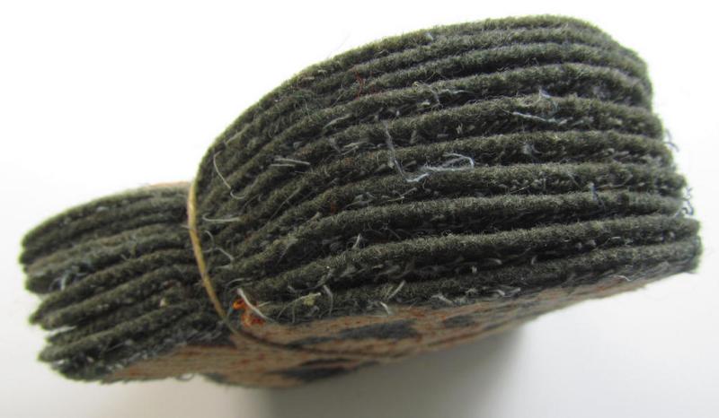 I recently uncovered a period-packed(!) 'bundle' holding 10 - fully identical! - examples of the 'standard-issue'-pattern, police- (ie. WH (Heeres) related) arm-eagle (ie. 'Ärmeladler') as was specifically intended for usage by the staff of the notorious 'Feldgendarmerie-Truppen' and that come all ten in an overall very nice- (ie. 'virtually mint- ie. unissued'- and/or simply never tunic-attached-), condition. The pieces are executed in bright-orange-coloured linnen and come mounted onto a piece of field-grey-coloured wool as to be expected (as can be seen on the pictures). These neat arm-eagles were specifically designed for usage by the 'Feldgendarmerie' (= field-police) units and saw wide-spread usage throughout the war. The eagles on offer here show truly great pronounced detail and come in a great (ie. 'minty' and/or truly never tunic-attached-), condition: they were never worn nor tunic-attached and and show an additional 'backing' made-out of (thin-shaped) cheese-duck as is more often seen (as can be seen on the pictures). My asking-price is naturally intended for a single piece. Simply a great occasion to acquire a superb 'Feldgendarmerie'-related 'Ärmeladler' for a competitive price!