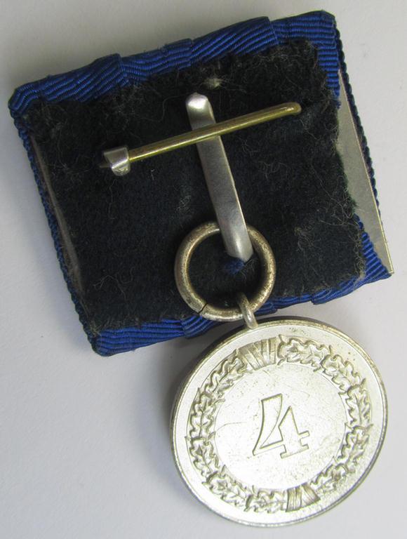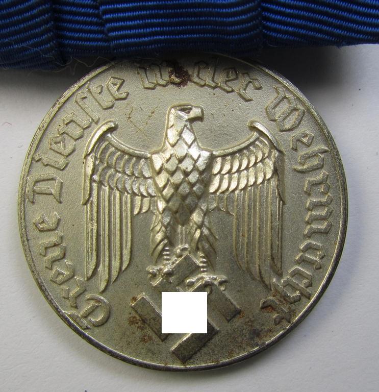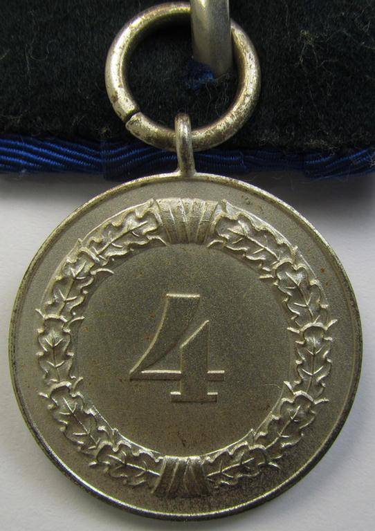 This is a truly very attractive - and I deem hardly used- nor worn! - example of a (bright!) silver-toned WH (Heeres o. Kriegsmarine) so-called: 'Einzelspange' or: single-pieced medal-bar (being of the desirable detachable-pattern!) showing a detailed: 'WH-Dienstauszeichnung 4. Stufe' (as was intended for 4 years of loyal-service) and that has a neat and pronounced (regular-sized) WH (Heeres o. Kriegsmarine) eagle-device period-attached and that comes mounted onto its confectioned, darker-blue- (ie. cornflower-blue-) coloured ribbon (ie. plate) as issued. The detail on this example is simply extraordinary: it has - I deem - never been cleaned nor polished and has a very attractive and non-tarnished) age-patina. The medal is 'mounted' onto a clasp (with functional pin/catch-set-up) as was intended for wearing this example on a 'going-out'- ie. dress-tunic or 'Waffenrock'. This example truly retains gorgeous details and has a great age-patina: it retains all of its somewhat 'frosted'- and/or: silver-toned finish without showing any defaults. It is neatly 'backed' with a piece of black-coloured wool and comes mounted onto a steel-based 'backing-plate' as is more often seen (as can be seen on the pictures). The darker-blue-coloured ribbon shows only minimal usage and/or staining. Simply a very attractive WH (Heeres o. Kriegsmarine) example (of the detachable pattern!) that comes mounted as an: 'Einzelspange'!