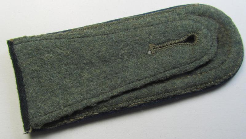 This is an attractive - albeit regrettably single - WH (Heeres) NCO- (ie. 'M36/M40'-pattern) shoulderstrap as piped in the darker-blue- (ie. 'blauer'-) coloured branchcolour as was intended for usage by an NCO (ie. 'Unteroffizier' or: junior-sergeant ie. medical-orderly) who served within a: 'Sanitäts-Abteilung' and that comes in an overall nice- (albeit moderately used ie. worn- and/or most certainly once tunic-attached-), condition. The neat strap is just moderately used and/or worn and does show some minimal wear, age and/or staining but is void of any damage or alike (as can be seen on the pictures). The strap shows the darker-blue- (ie. 'blauer'-) coloured- and desirable 'silk-like'-type piping and measures approximately 11 cms. in length. The piece shows the 'standard'-pattern silver-coloured, NCO-braid period-attached and comes mounted onto its tongue (as can be seen on the pictures). The strap is constructed from the typical darker-green-coloured wool and is with certainty a: 'standard-issued'- (ie. non-tailor-made) piece. These type of shoulderstraps are of the typical (early- ie. pre-)war-period pattern straps and were worn throughout the war). This particular strap originated from a smaller cloth- ie. shoulderstrap-collection I recently acquired for the web-site. Simply an attractive - and with certainty desirable! - 'Sanitäter'-related, NCO-type 'Heeres' shoulderstrap: too bad that it is only a single specimen!