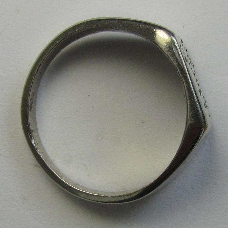 The neat - and with certainty male-type- and somewhat larger-sized - finger-ring is I deem executed in chromed-steel-based metal and retains great pronounced detail. As more often is it totally void of a makers'-designation or alike. The ring is clearly worn ie. used (it is still a bit tarnished and was with certainty never cleaned nor polished). The detail on the engraved text is, however, nicely preserved and void of any damage or alike (as can be seen on the pictures). The piece originates with certainty of a local Greek-production and was most certainly acquired as a souvenir from the Greek campaign in 1941. These 'souvenir'-rings could be privately purchased from local artisans and were very popular amongst the troops. Simply a neat and 100% genuine example that originates from a German private-household where it was recently uncovered. I deem that I have priced this Greek-campaign-'souvenir'-ring accordingly!