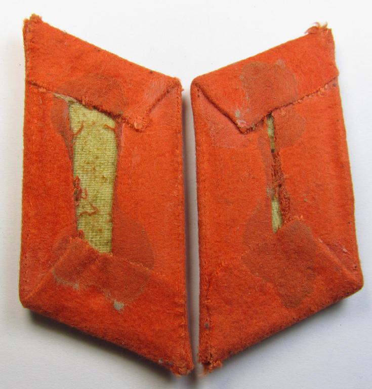 This is an attractive - fully matching and most certainly used- and/or carefully tunic-removed - pair of so-called: 'Gendarmerie'-related, officers'-pattern dress-collar-tabs (ie.: 'Kragenspiegel für den Ausgehjacke für Offiziere der Gendarmerie') that comes in an overall very nice- (ie. I deem just moderately used- and/or most certainly once tunic-attached-), condition. The collar-tabs are constructed from the typical, bright-orange- (ie. 'orangeroter'-) wool and show a bright-silver-coloured- and/or 'braid'-based (hand-embroidered!) surface. Moreover, do they show the typical buckram-based backing (as can be seen on the pictures). The tabs are just a bit 'tarnished' and dirty caused by normal age and/or storage for decades (as can be seen on the pictures). This particular collar-tab -pair originates from a smaller 'Polizei- & Gendarmerie'-collection that I recently acquired for the web-site. Simply an attractive pair of 'Gendarmerie'-related, officers'-pattern collar-insignia: I deem that I have priced this attractive and minimally used pair accordingly!