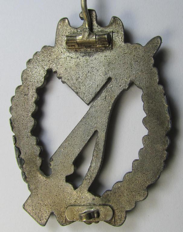 Attractive, 'Infanterie Sturmabz. in Silber' (or: silver-class infantry assault badge ie. IAB) being a detailed albeit unmarked example (of the 'long-barrel-hinge'-variant) as executed in 'Feinzink' as produced by the: 'Steinhauer & Lück'-company