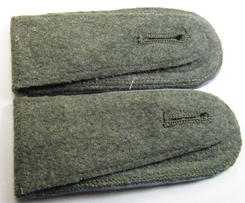 The truly attractive - and fully matching! - shoulderstrap-pair is (I deem) of the typical mid-war-period- (ie. 'M43'-) pattern and does show only minimal age, wear and/or staining. The pair has the field-grey-coloured- and/or woolen-based 'upperdecks' and does show the neat light-blue- (ie. 'kornblumenblauer'-) coloured branchcolour and desirable 'silk-like'-type piping attached (as can be seen on the pictures). The shoulderstraps - which are fully matching in all details - come naturally mounted onto their original tongues attached and were with certainty pieces that were used as a pair on a 'front-type'-tunic. The pair - which measures approximately 11,7 cms. in length - was used by an NCO holding the rank of: 'Feldwebel' (ie. sergeant) who was attached to one of the: 'Nachshub-Abteilungen' (or: one of the specific army transport-units). The pair shows the neat bluish-grey-coloured (ie. truly sub-dued-type) NCO-braid and two (identical, aluminium-based) pips period-attached. Simply a great 'text-book'-pair of mid-war period, NCO-type shoulderstraps as was intended for a: 'Feldwebel eines Nachschub-Abteilungs o. Regiments' and that is with certainty accordingly priced!