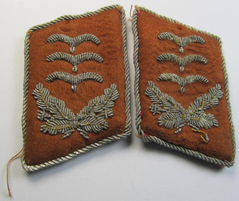 The neat - fully matching and carefully tunic-removed! - 4-pieced LW-insignia-set was with certainty always together and was recently found together as such. The neatly shoulderboards - which are constructed from the light-brown- (ie. 'hell- o. kupferbrauner'-) coloured and/or: 'smooth-type' (ie. moleskin-like-) wool - come in a moderately used- and/or carefully tunic-removed, condition. The pair has somewhat shiny, bright silver-coloured 'upperdecks' as to be expected for a true LW-pair. The boards are just a bit 'tarnished' ie. stained by normal age. The boards - which measure approximately 11 cms. in length each - show two matching sets of (golden-toned- and regular-sized) pips period-attached, denoting the officers'-rank of: 'Hauptmann' (ie. captain). The boards never had any tongues and were clearly used as a pair of the 'sew-in'-pattern (as can be seen on the pictures). The boards came with an equally nicely preserved (and also worn- ie. also once tunic-attached) pair of neatly hand-embroidered, officers'-type collar-patches (ie. 'Kragenspiegel für Offiziere der Luftwaffe') which are also piped in the light-brown- (ie. 'hell- o. kupferbrauner'-) coloured branchcolour. The silver-toned hand-embroidery - which is executed on a brown-coloured- and/or typical 'smooth woolen'-based background as to be expected - shows some staining, age and/or wear (as can be seen on the pictures). The set is neatly 'backed' with beige-coloured, buckram-based material as is more often encountered. This interesting 4-pieced, LW insignia-grouping belonged to a: 'Hauptmann u. Mitglied der Nachrichten-Truppen' who was issued this set, used it and then stored it as such for decades. Simply an attractive Luftwaffe 'Nachrichten'- (ie. signals) related insignia-grouping that is - I deem - accordingly priced!