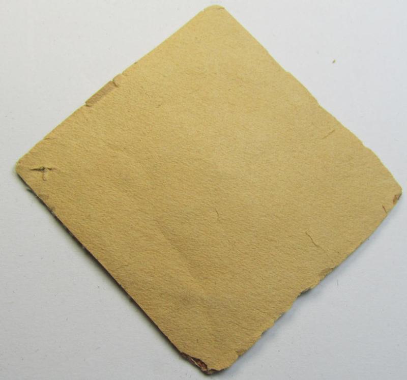 This is an attractive - and with certainty not that often seen! - multi-coloured (and nicely woven!) patriotic badge (ie. 'N.S.D.A.P.-supportive piece) being an example that shows a black-coloured swastika mounted onto a white- and black-coloured backing and that comes in an overall nice, condition. The square-sized piece measures approximately 5,3 x 5,3 cms. was once glued into an album or alike and was then carefully cut-out: it still shows the carton on its back (as can be seen on the pictures). It originated from the US where it was found amongst other TR-related insignia. Simply an attractive, patriotic-styled N.S.D.A.P.-related piece that presumably dates from the thirties and that can be easily described as an example of typical 'Nazi-Kitsch'!