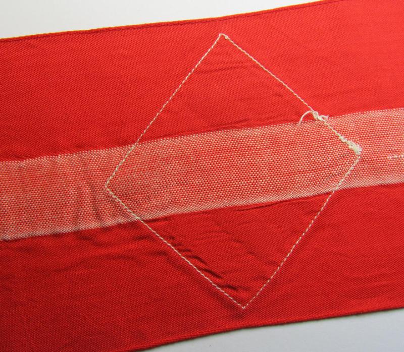 This is a very attractive - and I deem simply never worn nor used! - example of a 'standard'- (ie. entirely woven-) pattern, bright-red-coloured so-called: HJ- (ie. 'Hitlerjugend'-) related armband (ie. 'Armbinde') being a never assembled (ie stitched-together) example that regrettably misses its 'RzM'-etiket and that comes in an overall very nice- (ie. 'virtually mint ie. unissued'-), condition. These linnen-based armbands were 'standard'-issue for usage by the various HJ- (ie. DJ-) members and/or officials (and were worn on the left upper-arm of the linnen shirts and/or tunics). This example - which was simply never sewn-together as stated avove - has a total size of approximately 50 cms. and is 11 cms. wide as usual - and is constructed from bright-red-coloured linnen. It shows a horizontally- (and neatly interwoven!) white-coloured 'centre-stripe'. Next to this, it shows a square-sized: 'swastika'-patch attached (as can be seen on the pictures). The neat armband - that is void of a paper-based 'RzM'-etiket as more often - was - I deem - simply never used nor worn: it is just a tiny bit wrinkled and shows minimal age and/or staining simply caused by decades of storage (as can be seen on the pictures). Simply an attractive and desirable, 'standard'-pattern HJ-related 'Armbinde' that is - I deem - accordingly priced!