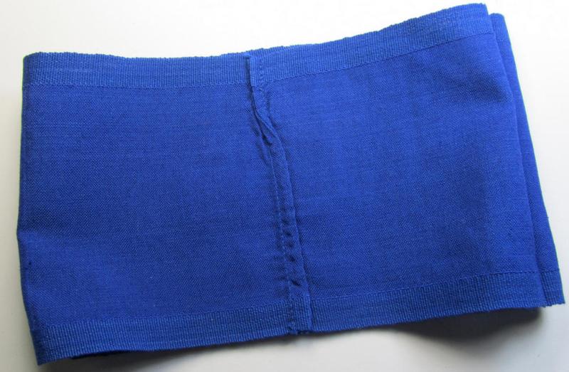 This is an attractive - and with certainty scarcely encountered! - multi-coloured- and EM- (ie. NCO-) pattern, so-called: 'Reichsluftschutzbund' (ie. 'RLB'-) service-armband (ie. 'Dienst-Armbinde') that is executed in the neat 'BeVo'-weave-pattern and that is depicting a white-red-coloured 'Cross'-symbol onto a bright blue-toned background as was specifically intended for usage by a member serving within the: 'RLB erweiterten Selbstschutz' and that comes in an overall very nice- (ie. 'virtually mint- ie. unissued'- and I deem simply never tunic-attached-), condition. These attractive armbands were worn on the various blue-coloured RLB- (ie. eventually WLS- ie. 'Werk-Luftschutz'-related) tunics throughout the war. The nicely detailed armband on offer here - which measures folded approximately 40 x 10,5 cms. - simply shows no wear nor damage whatsoever: it just shows some minimal staining ie. storage-age only (as can be seen on the pictures). Simply an attractive - and with certainty scarcely encountered! - 'Reichsluftschutzbund' (ie. 'RLB'-) service-armband as was specifically intended for usage by the: 'RLB erweiterten Selbstschutz'!