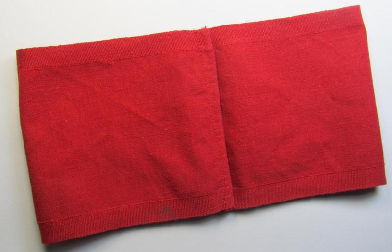This is an attractive - and with certainty scarcely encountered! - bright-red-coloured- and EM- (ie. NCO-) pattern, so-called: 'Reichsluftschutzbund' (ie. 'RLB'-) service-armband (ie. 'Dienst-Armbinde') that is executed in the neat 'BeVo'-weave-pattern on a bright-red-toned background as was specifically intended for usage by a member serving within the: 'RLB-Werkluftschutz' (or: or factory-protection-service) and that comes in an overall very nice- (ie. 'virtually mint- ie. unissued'- and simply never tunic-attached-), condition. These attractive armbands were worn on the various blue-coloured RLB- (ie. eventually WLS- ie. 'Werk-Luftschutz'-related) tunics throughout the war. The nicely detailed armband on offer here - which shows the neatly interwoven 'borders' - measures folded approximately 40 x 10,4 cms. - simply shows no wear nor damage whatsoever: it just shows some minimal staining ie. storage-age only (as can be seen on the pictures). Simply an attractive - and with certainty scarcely encountered! - 'Reichsluftschutzbund' (ie. 'RLB'-) service-armband as was specifically intended for usage by the members serving within the: 'RLB-Werkluftschutz'!