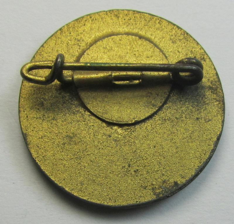 This is a truly very attractive - and very nicely preserved! - example of a multi-coloured (ie. painted!), so-called: 'Gauleistungsabzeichen in Gold für KK-Gewehr 1944 des Standschützenverbandes Tirol-Vorarlberg' being a smaller-sized and/or typical circular-shaped 'variant'-example that was specifically awarded for a specific shooting-contest held on the 'Gau'-level (using a small-caliber weapon ie. 'KK-Gewehr') being a non-maker marked example that comes in an overall very nice- (ie. just minimally used- ie. worn-), condition. The very detailed - and somewhat smaller-sized - badge (having an approximate diameter of only 2,5 cms.) is executed in multi-coloured and nicely painted (bright-golden-toned) zinc (ie. 'Feinzink'): it is void of any damage and retains a nicely preserved (bright) golden-toned finish and green-coloured, painted border (just some minimal staining ie. paint-loss is visible). The badge comes naturally mounted onto its functional- and fully unaltered pin- ie. pin-catch-set-up (as can be seen on the pictures). A similar example is also figured in the Heering-Hüsken lapel-pin-catalogue, wherein it is given the unique reference-number: 'A61KA' and wherein it is given an estimated value of 150 Eu. Simply an attractive - and later-war-period! - shooting-award that is offered for an interesting price!