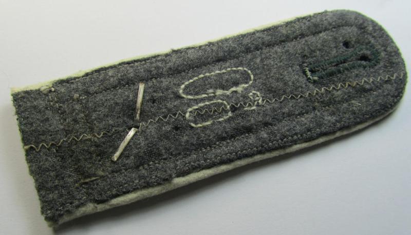 This is an attractive - albeit regrettably single! - (I deem) early-war-period- (ie. 'M36'/'M40'-type and/or rounded-styled) neatly 'cyphered', WH (Heeres) NCO-type shoulderstrap as piped in the white- (ie. 'weisser'-) coloured branchcolour as was specifically intended for usage by a: 'Feldwebel des Infanterie-Regiments 60' (or: sergeant who served within the infantry-regiment, numbered: '60') and that comes in an overall nice- (albeit moderately used- ie. worn and/or carefully tunic-removed- ie. 'cut-off'-), condition. The neat strap - which is of the early-war-type - just shows some moderate age and wear but is void of any real damage or alike: it has the darker-green-coloured- and/or woolen-based 'upperdeck' and does show as stated above the white- (ie. 'weisser'-) coloured branchcolour and/or woolen-type piping attached (as more often seen). The shoulderstrap comes without a tongue: it was worn as a piece of the 'sew-in'-pattern and was carefully 'cut-off' (ie. tunic-removed). The strap - which measures approximately 12,8 cms. in length - shows the (typical Heeres-pattern, regular-styled) silver-toned NCO-braid and single ('Buntmetall'-based) pip attached and shows the neat (machine-embroidered by means of so-called: 'Kurbelstickerei'-): '6'- and '0'-cyphers ie. numerals (which are executed in the white- (ie. 'weisser'-) coloured wool as to be expected as can be seen on the pictures). Simply a neat and/or fully 'text-book' and actually not that often encountered! - 'Heeres'-type, 'cyphered' NCO-shoulderstrap that belonged to a: 'Feldwebel des Infanterie-Regiments 60': too bad that it is only a single specimen!
