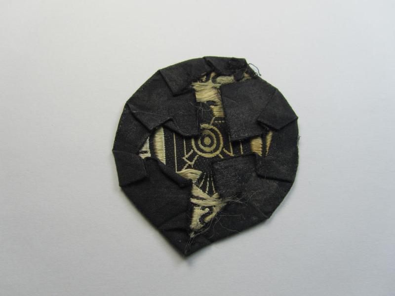This is a truly attractive - and with certainty scarcely encountered! - linnen-based, so-called: 'Auszeichnung für Schiessleistungen des Deutscher Schützenverbandes Gau Westfalen' (ie. DSV), being an example as was executed in so-called: 'BeVo'-weave-pattern and that comes in an overall nice- (ie. moderately worn- ie. somewhat confectioned-), condition. The patch (which measures 6,8 x 6 cms.) was I deem once worn and/or issued (I deem that it was once even tunic-attached). It only shows some minimal aging caused by regular usage and/or wear (but it is totally undamaged). The neat piece - that shows the 'DSV'-symbol surrounded by text and showing two swastikas - is executed in silverish-white-coloured linnen on a black-coloured- (and/or linnen-based) background. Regrettably, could I not find any in-deth reference-material regarding this (with certainty) scarcely encountered 'DSV'-shooting-award: I deem that it is accordingly priced!