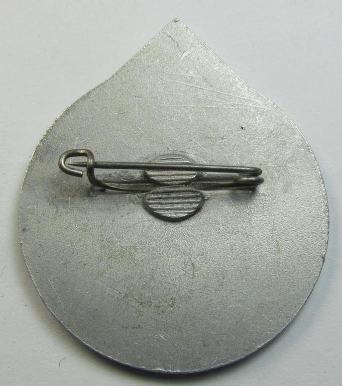 This is an attractive - and actually not that easily encountered! - N.S.D.A.P.-related (and regional-issued!) day-badge (ie. 'tinnie' or: 'Veranstaltungsabzeichen') that is executed in (bright) silverish-toned and aluminium-based metal and that depicts an illustration of a worker, swastika and two crossed hammers coupled with the text: 'Kreisparteitag - Aachen-Stadt - Aachen-Land - 10 Jahre Ortsgruppe Aachen - 1935' and that was as such intended for an: N.S.D.A.P.-related gathering ie. rally held in the town of Aachen in the year 1935. The somewhat larger-sized- and circular-shaped badge - which has an approximate height of 5 cms. - is void of any makers'-designation and comes in an overall nice (albeit issued and/or minimally worn-), condition: it shows extraordinary detail and was almost certainly never cleaned nor polished (some minimal staining is, however, present and visible as can be seen on the pictures). It comes naturally mounted on its (functional) pin-/catch set-up. Simply an attractive - and most certainly not that often encountered! - N.S.D.A.P.-related (and regional issued!) 'tinnie' that is with certainty accordingly priced!