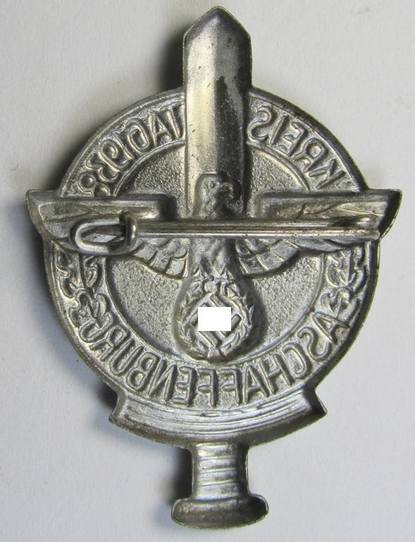 Attractive, bright silverish-toned- (and/or typical zinc-based) N.S.D.A.P.-related day-badge (ie. 'tinnie' or: 'Veranstaltungsabzeichen') as was issued to commemorate the: 'Kreisparteitag - Aschaffenburg - 1938'