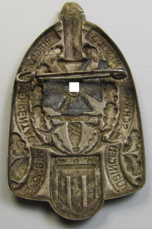 The attractive - and fairly early-period - 'Nationalsozialistischer Kriegsopferversorsung'- (ie. 'N.S.K.O.V.'-) related day-badge (ie. 'tinnie' or: 'Veranstaltungsabzeichen') is executed in silverish-grey-coloured- and/or (I deem) zinc- ie. tin-based metal: it shows some minimal wear and/or moderate age (but has never been cleaned nor polished and retains a nicely preserved, age-patina). The shield-shaped badge comes naturally mounted onto its functional pin- ie. catch set-up and shows some minimal age- and/or staining (as can be seen on the pictures). The 'tinnie' is quite detailed and shows an illustration of the (typical) N.S.K.OV.-logo and depicts the text: '3. Schwäb. Frontsold. Kriegsopfer Ehrentag - Tübingen - 11.8.1935'. It should be noted that all 'N.S.K.O.V.-related tinnies that were intended to commemorate an event at town- ie. 'Gau'-level (such as the piece on offer here) saw much more limited usage and can easily be graded 'fairly scarce'. Of course, did I price this attractive - and with certainty not that often seen! - example accordingly!