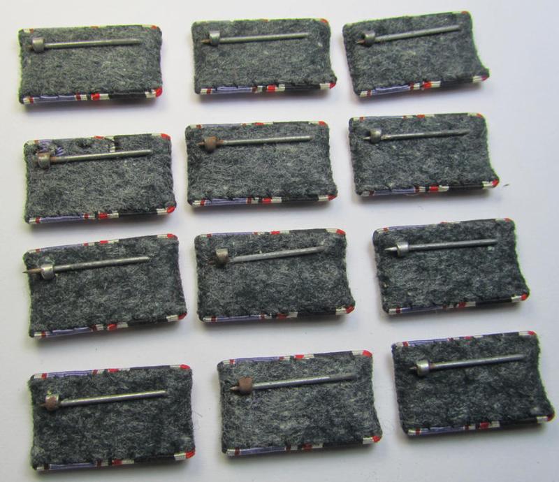 I recently uncovered a small lot comprising of 12 examples of the two-pieced, (genuine) WWII-period ribbon-bars (ie. 'Feld- o. Bandspangen') that each depict the (unusually seen!) combination: 'Kriegsverdienstkreuz der II. Klasse ohne Schwertern' (or: war merits'-cross second class without swords) and a: 'Luftschutz-Ehrenzeichen 2. Stufe' (or: air-raid warden medal 2nd class) that come all twelve in an overall very nice- (and simply never issued- nor worn-), condition. The pieces - which originated from the 'left-overs' of an old tailor-shop - are 'standard-issue'-pattern, two-pieced ribbon-bars (ie. 'Feld- o. Bandspangen') of which both bars are of the smaller (ie. regular 1,5 cm. wide-sized-) version: all pieces measure thus 3 cms. in length. The pieces are all neatly 'backed' with a piece of field-grey-coloured wool as to be expected. The bars come in an overall nice condition and are naturally fully functional: they just show some minimal storage-age ie. staining (as can be seen on the pictures). My asking-price is naturally intended per single 'Feld- o. Bandspange'. Simply a nice opportunity to acquire a neat 2-pieced ribbon-bar that can be used for almost every TR-tunic!