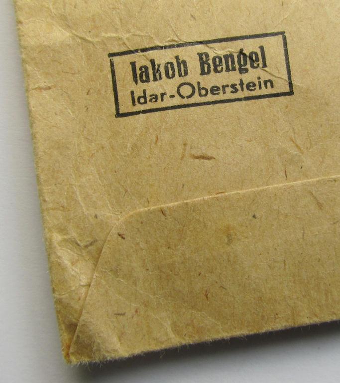 This is an attractive example of an: 'Ehrenkreuz der deutschen Mutter - dritte Stufe' (or: bronze-class mothers'-cross) being a virtually 'mint' albeit certainly issued - example that came together with (ie. mounted onto-) its accompanying, long-sized- (and/or full length and slightly confectioned!) ribbon (ie. 'Bandabschnitt') and that came packed in its period- (ie. beige-coloured- and/or 'Zellstoff'-based) pouch by maker: (ie. 'Hersteller') named: 'Jakob Bengel') and tha comes as issued and/or recently found. The award has truly no enamel damage whatsoever and comes in a very attractive and/or totally uncleaned, condition. The very bright (ie. minimally tarnished) bronze-coloured finish is simply excellent without showing any defaults. The ribbon (which is actually not that easily encountered) came in a minimally confectioned- and/or full-length condition (as can be seen on the pictures). The pouch comes in an equally very nicely preserved (and fully untouched) condition. Simply a great, bronze-class 'MK-set' without any defaults: almost impossible to upgrade this attractive, bronze-class MK-set!