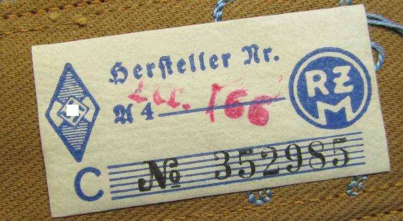 This is a very attractive - fully matching and actually not that easily found! - pair of early-pattern, so-called: 'Flieger-HJ' (ie. 'Hitlerjugend') light-blue-piped shoulderstraps as was intended for usage - and presumably worn by! - a: 'Hitlerjunge' who was attached to the: 'Bann 190' (Bann 363 = Bann Stade / Niederelbe) as situated in the 'Gebiet Nord-Nordsee') and that comes in an overall very nice- (I deem just moderately used- ie. I deem carefully tunic- or shirt-removed-), condition. The straps - which are executed in typical, beige-tan-coloured linnen as to be expected - have the bright-blue- (ie. 'hellblauer'-) coloured- (and typical rayon-based) piping attached and show the machine-embroidered - by means of 'Kurbelstickerei' (and/or equally coloured) so-called: '190'-numerals (ie. 'Ziffern'). The straps never had a tongue attached and come as found and/or issued: the pair is of 'sewn-in'-pattern and was also presumablyused as such). The straps measure spproximately 12 cms. in length and do show some minimal age ie. staining simply caused by minimal wear and/or decades of storage only. One of the straps still shows its period attched RzM-etiket (as can be seen on the pictures). It should be noted that all 'cyphered' (ie. 'Hitlerjugend') shoulderstraps can easily be graded 'scarce' even more so when they are of the desirable early-pattern!