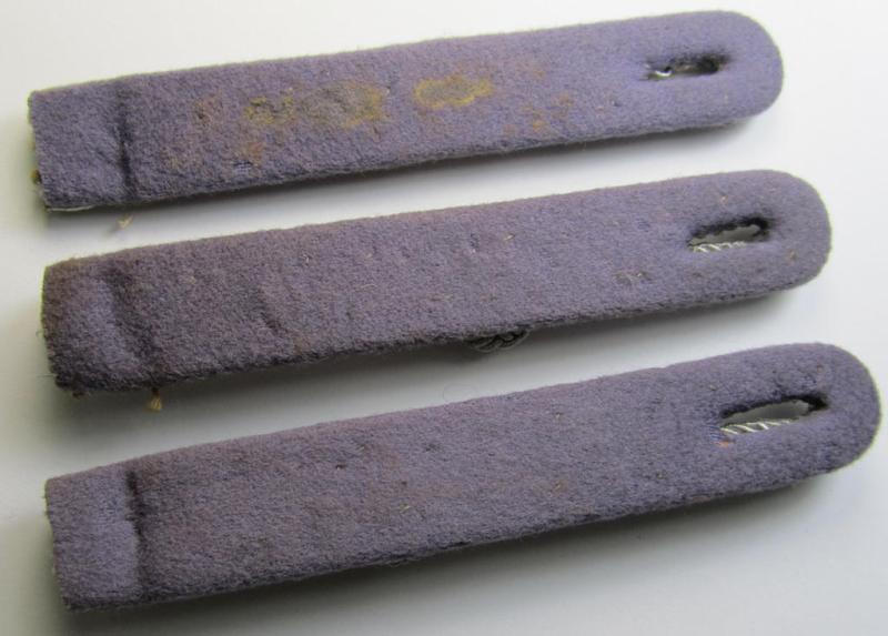 This is an Interesting - and actually not that often found! - three-pieced shoulderboard-grouping comprising of three single, 'Luftschutz' (ie. RLB-related) officers'-pattern shoulderboards ('Schulterstucke für Offiziere des Reichs-Luftschutz-Bundes') as specifically intended for usage by: 'RLB'-officers respectively holding the ranks of: 'Luftschutzführer' (comparable with a 'Leutnant'-rank) upto 'Luftschutz-Hauptführer' (comparable with a: 'Hauptmann'-rank) and that come all three in an overall nice- (ie. I deem just moderately used- and/or carefully tunic-removed-), condition. The neat boards - which are all three of the pre- (ie. early-war-) pattern and that all three show some minimal staining and/or age but that are void of any real damage - are constructed from the (typical) lilac-purple-coloured- and/or smooth-type wool (as to be expected). The boards are of the specific pattern that was used on the RLB-tunics before (and throughout) the war. The three boards are respectively for a: 'Luftschutzführer', a: 'Luftschutz-Oberführer' and a: 'Luftschutz-Hauptführer'. Simply an attractive - and actually not that often seen! - 'Luftschutz' (ie. RLB-related-) officers'-pattern shoulderboard-grouping: too bad that it only deals with single specimen and not pairs!