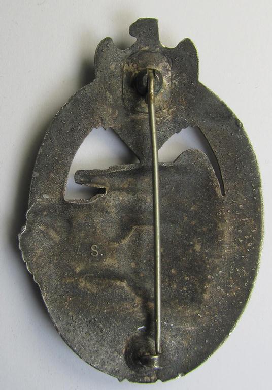 This is a truly attractive - and I deem only moderately used - example of a so-called: 'Panzerkampfabzeichen in Silber' (or: silver-class panzer-assault badge or PAB) being a clearly maker- (ie. 'AS'-) marked- and/or zinc- (ie. 'Feinzink'-) based specimen as was with certainty procuced by the: 'Adolf Scholze'- (ie. 'A.S.'-) company and that comes in an overall nice- (and I deem only moderately used- ie. worn-), condition. The badge on offer here concerns a mid-war-period, typical zinc- ie. 'Feinzink'-based specimen that retains almost all of its (fairly frosted- and somewhat darkened ie. tarnished-) silver-coloured finish and that has a very attractive appearance, still showing pronounced detail as to be expected by a badge by this particular maker. The badge has never been cleaned nor polished (and is still also a tiny bit dirty ie. stained- ie. tarnished as mentioned above). As stated is the piece a neatly maker-marked example that shows the various characteristics - such as for example the typically ball-shaped pin-set-up, silver-coloured thin-shaped pin and/or modelled catch - as only seen on PABs as produced by the: 'Adolf Scholze'-company based in the town of Gablonz: it deals with a so-called: 'semi-hollow pattern' (as is uniquely numbered with the reference-number: '3.1.4.' according to the excellent reference-work entitled: 'The Panzer-Assault badge of WWII' by my Belgian friend Philippe de Bock). The very attractive piece naturally shows all the details as to be expected for a badge by this particular maker. It was recently found as such at a German private-household and was never before part of a collection. The piece comes naturally mounted onto its fully functional pin- and/or catch (as can be seen on the pictures). Simply a very attractive and honest silver-class PAB by the desirable 'Adolf Scholze'-company that is accordingly priced!