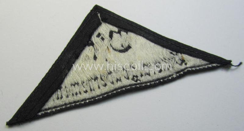This is an attractive 'female'- ie. 'BDM'- (or: 'Bund Deutscher Mädel'-) related specimen, indicating that it is neatly woven in silver-white-coloured linnen on a black-coloured (and also linnen-based-) background. This example was I deem just moderately used- and once tunic- (ie. shirt-) attached but is void of its (presumably once-attached) 'RzM-etiket' (as can be seen on the pictures). The piece just shows some minimal staining caused by decades of storage and moderate wear (as can be seen on the pictures). It should be mentioned that this is one of the rarely seen (foreign) 'BDM-Gebietsdreiecke' within the extensive series. Simply a very attractive, female-type 'BDM'- (ie. 'Bund Deutscher Mädel') district-triangle that is priced according to its comparative rarity and/or desirability!