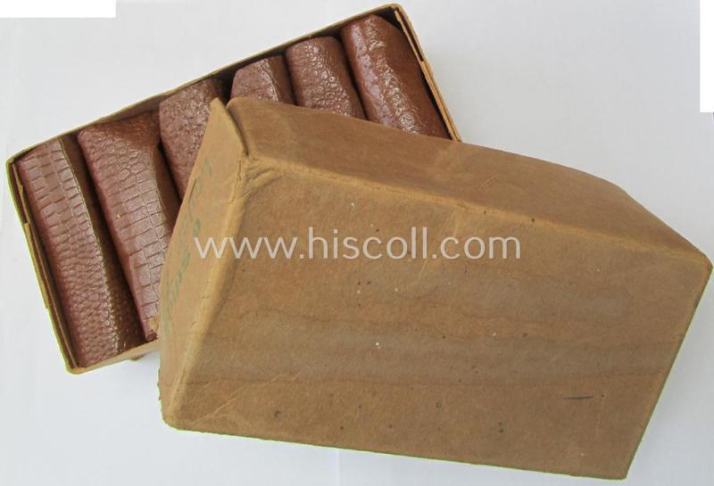 I recently found an original (period!) carton box that held six - fully identical! - examples of the 'standard-issue'-pattern, WH sun- (ie. protective-) glasses (or: 'Schützbrille') of the make ie. type: 'Zeiss - Umbral' that came stored in their period, typical light-brown-coloured- and/or 'plastic-like'-based (ie. 'Ersatz'-type) etui and that come all six in a 'virtually mint- ie. unissued'- and/or simply never worn- nor used, condition. The pairs - which are all six constructed from greyish-coloured, genuine leather - come with their fully undamaged (brown-coloured) glasses in place and still hold their period-attached and fully elastic carrying-straps (ie. 'Haltebänder'). The pairs came stored in their period, typical light-brown-coloured- and/or 'plastic-like'-based etui (that all have a functional (by 'Prym'- marked) 'snap' in place as can be seen on the pictures. Of additional interest is, moreover, the fact that these specimen came with their period instruction-leaflets. These neat service-glasses saw widespread-usage througout the war and numerous pictures exist wherein this type of equipment is seen being worn. All six sets show some minimal storage-age only (but are fully functional and totally undamaged). My asking-price is naturally per single set/pair. Simply a nice occasion to acquire a neat - and fully complete! - 'Wehrmacht'-equipment-item that is not that often offered for sale in this 'virtually mint- ie. unissued'-condition!