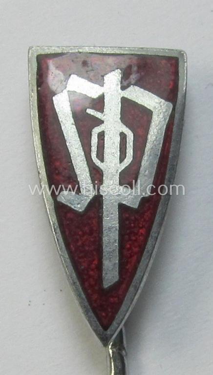 This is a neat - multi-coloured- and nicely enamelled! - so-called: membership-lapel-pin (ie. 'Mitgliedsabzeichen') as was specifically intended for members serving within the: 'Sudetendeutschen Partei' being a nicely preserved and/or typical non-maker-marked example that comes as issued, moderately worn and/or recently found. The neat - and somewhat smaller-sized, shield-shaped - piece shows some moderate wear and/or age (mainly dirt and/or minimal staining) but is totally void of any enamel-damage or alike (as can be seen on the pictures). The silver-toned lapel-pin - which comes naturally mounted onto its functional pin - shows in its centre the (silver-toned) logo of the: 'Sudetendeutschen Partei (o. SDP)' (as can be seen on the pictures). A similar lapel-pin is also figured in the Heering-Hüsken lapel-pin-catalogue wherein it is given a unique reference-number (B8 10A) and is given an estimated value of 40 Eu. Simply an attractive TR-lapel-pin that is with certainty accordingly priced!