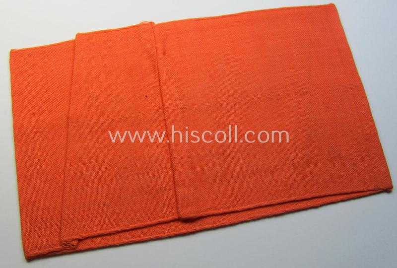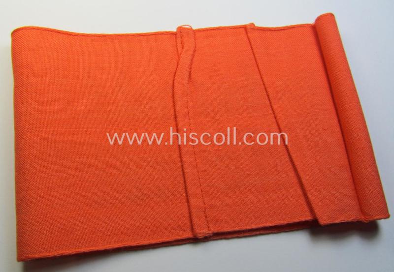 This is a truly attractive - and with certainty rarely encountered! - bright-orange-coloured example of a WH (Heeres) related armband (ie. 'Armbinde') entitled: 'Verkehrs-Aufsicht' being an example of the 'partly-woven'-type in a technique similar to the 'BeVo'-weave pattern and that comes in a just minimally used- (ie. still 'virtually mint'-), condition. These linnen-based armbands were presumably intended for usage by military staff-members (ie. officers) tasked with traffic-control duties at the front and were presumably worn on the left upper-arm of the regular WH (Heeres) greatcoats and/or (officer-) tunics. This example - which has been 'off-factory sewn-together - has a total size of approximately 37 cms. and is 10,5 cms. wide - and is constructed from bright-orange-coloured linnen and shows the neatly interwoven text: 'Verkehrs-Aufsicht'. The armband is totally void of an ink-stamp (ie. 'Dienstsiegel') and is just a tiny bit stained and is moreover a tiny bit wrinkled. The piece is very nicely made and shows only moderate age ie. staining (simply caused by decades of storage and/or minimal wear). This example originates from a larger-sized armband-collection that was compiled over many years and that I recently acquired for the web-site. Simply a very attractive - and with certainty scarcely encountered! - WH (Heeres) related armband that is with certainty accordingly priced!