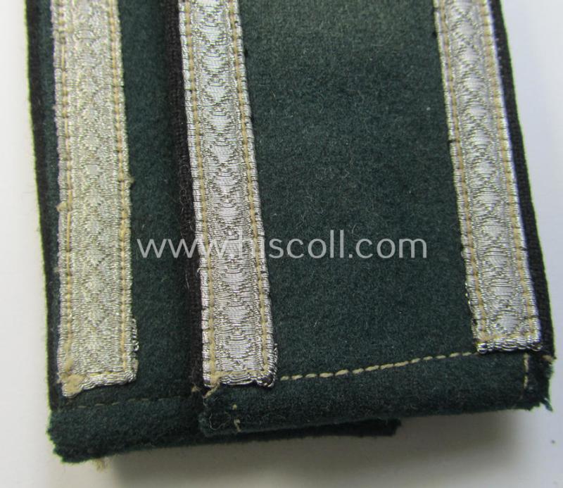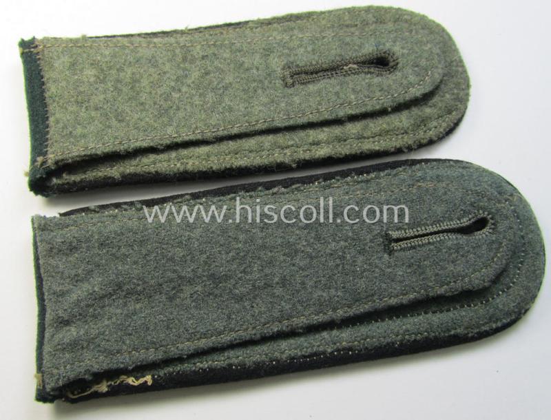 This is an attractive - albeit mis-matched but most certainly worn as such - pair of (I deem) 'standard-issued'- (ie. 'non-privately-purchased'!) pattern, WH (Heeres) early-war period- (ie. 'M36'- ie. 'M40'-pattern and/or: rounded-styled) NCO-type shoulderstraps (ie. 'Schulterstücke für Unteroffiziere des Heeres') as was piped in the desirable black- (ie. 'schwarzer'-) coloured branchcolour as was specifically intended for usage by an: 'Unteroffizier eines Pionier-Bataillons' (or: junior-sergeant who served within an army-enigineers' battailon) and that comes in an overall nice- (ie. just moderately used- ie. worn-), condition. The neat straps - which have both the 'standard'-pattern, darker-green-coloured and/or typical 'smooth woolen'- based 'upperdecks' and that measure approximately 11,2 cms. in length each - show the neat black- (ie. 'schwarzer'-) coloured and/or typical woolen-type piping attached (as can be seen on the pictures). Moreover, do the straps show the typical ('standard-pattern') silverish-toned NCO-braid attached and come naturally mounted onto their period-attached tongues attached and come both in a very nice- (ie. fully 'text-book') condition overall (as can be seen on the pictures). The neat pair only shows moderate wear and/or age but is, nevertheless, still nicely preserved (as can be seen on the pictures). I deem this an excellent occasion to acquire a neat - albeit mis-matched! - NCO-type, 'Pioniere'-related shoulderstrap-pair for a justified price!