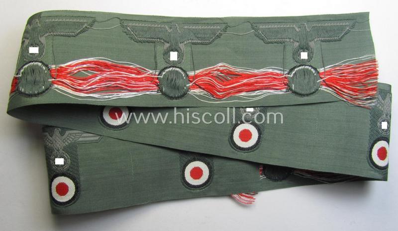I recently found a complete 'strip' comprising of ten - fully identical! - examples of the attractive WH (Heeres) so-called: 'M42-pattern' T-shaped cap-eagle/cocardes (ie. cap-trapezoids) as was specifically produced for usage on the (impopular) 'M-42'-model side-caps (ie. 'Schiffchen-Mützen') and that come all ten in an overall very nice- (ie. 'virtually mint- ie. unissued'- and/or never cap-attached-), condition. The pieces are neatly executed in so-called 'BeVo'-weave-pattern and were never folded, confectioned nor cap-attached: they come 'as straightly of the role'. The ten pieces - which were as stated above specifically produced for the the (impopular) 'M-42'-model side-caps (ie. 'Schiffchen') - saw also usage on the much more popular 'M43'-model caps (ie. 'Einheitsfeldmützen'). The pieces are executed in bluish-grey-coloured linnen on a field-grey-coloured (and/or also linnen-based) background as to be expected (as can be seen on the pictures). My asking-price is naturally intended for one single trapezoid (which I will carefully cut-off). Simply a nice occasion to aquire an attractive and 'BeVo'-woven, T-shaped 'M42-pattern'-cap-trapezoid for a competitive price!