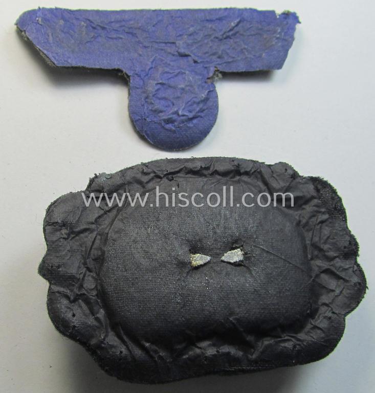 This is an attractive - truly detailed and actually not that easily encountered! - WH (Heeres) officers'-pattern, visor-cap eagle/cocarde-set (ie. 'Effektensatz für Schirmmütze') being both hand-embroidered examples that come mounted onto a typical darker-green-coloured- and/or (smooth)woolen-based background and that come both in an overall nice- (I deem issued- albeit never visor-cap-attached-), condition. These - with certainty 'high-quality'-produced examples - are executed in multi-coloured, silverish 'braid' and are executed onto a typical woolen- and/or darker-green-coloured background. The eagle has an approximate 'wingspan' of 6,5 cms. and is nicely backed with a piece of blue-coloured (thin-shaped) paper as more often seen whereas the cocarde (that has a metal-based inner-cocarde) shows a (similar) black-coloured backing (as can be seen on the pictures). Simply a very attractive - and most certainly not that easily encountered! - Heeres-related officers'-type visor-cap-insignia-set that would nicely fit to restore any Heeres officers'-type visor-cap- ie. 'Schirmmütze'!