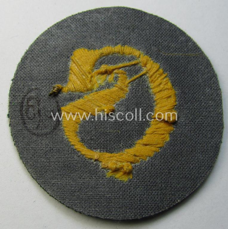 This is a truly attractive example of a WH (Heeres) so-called: trade- and/or special-career arm-insignia (ie. 'Laufbahn- o. Tätigkeitsabzeichen') as was specifically intended for a: 'Schirrmeister' (or: equipment-administration staff-member ie. NCO) being a neatly hand-embroidered variant as mounted onto a darker-green woolen background and that comes in an overall very nice- (I deem 'virtually mint- ie. unissued'-), condition. The neat patch is executed on darker-green-coloured wool and shows a detailed (and neatly hand-embroidered!) Gothic-styled 'G'-character. The patch - which is neatly backed with greyish-coloured 'cheeseduck' as more often - denoted that the soldier ie. NCO who wore it (ie. for whom it was intended) had succesfully passed several tests and could therefore be regarded as a: 'Schirrmeister'. The patch shows some minimal staining, simply caused by decades of storage only. Simply an attractive WH (Heeres) trade- and/or special-career arm-insignia (ie. 'Laufbahn- o. Tätigkeitsabzeichen')!