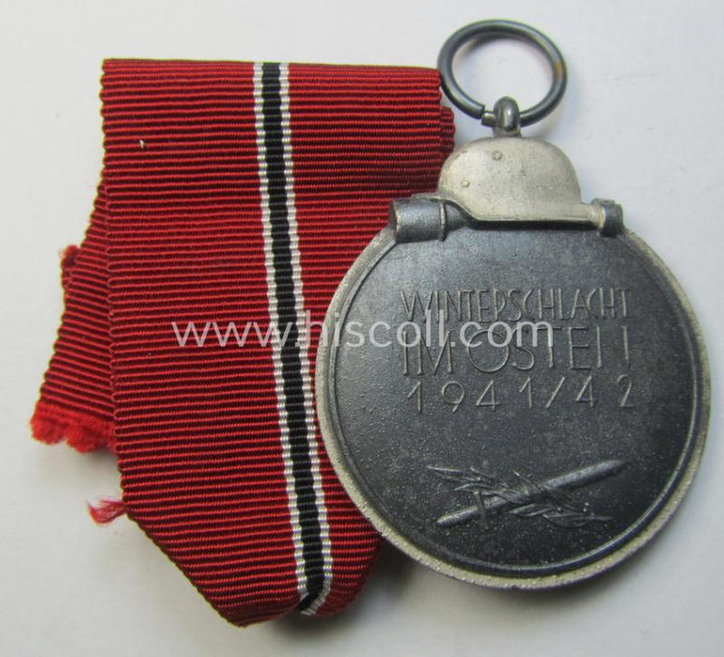 Attractive medal-set: 'Winterschlacht im Osten 1941-42' being a maker- (ie. '6.'-) marked- (and/or 'Feinzink'-based) specimen by the maker: 'Fritz Zimmermann' and that comes together with its (minimally confectioned) ribbon (ie. 'Bandabschnitt')