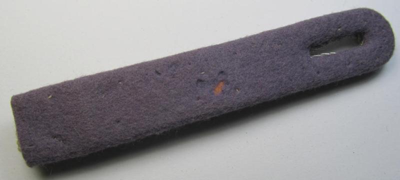This is an interesting - albeit regrettably single but actually not that often found! - 'Luftschutz'- (ie. RLB-) related officers'-pattern shoulderboard ('Schulterstück für Offiziere des Reichs-Luftschutz-Bundes') as was intended for: 'RLB'-officers holding the rank of: 'Luftschutzoberführer' (comparable with an: 'Oberleutnant'- ie. lieutnant first-class rank) and that comes in an overall nice- (ie. I deem just moderately used- and/or carefully tunic-removed-), condition. The neat board - which is of the pre- (ie. early-war-) pattern and that shows some minimal staining and/or age but that is void of any damage - ise constructed from the (typical) lilac-purple-coloured- and/or smooth-type wool (as to be expected). The board is of the specific pattern that was used on the RLB-tunics before (and throughout) the war. Simply an attractive - and actually not that often seen! - 'Luftschutz' (ie. RLB-related-) officers'-pattern shoulderboard that is I deem accordingly priced!