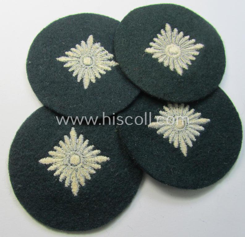 I recently encountered four - fully identical! - so-called WH (Heer) rank-insignia (ie. silver-grey-coloured and machine-embroidered 'roundels') as intended for an: 'Oberschütze', 'Oberkannonier', 'Oberjäger' etc. all four pieces coming in an overall very nice- (ie. 'virtually mint- ie. unissued'-), condition. The patches on offer here are neatly machine-embroidered on a darker-green-coloured (and/or woolen-based) background and shows no defaults whatsoever: they were simply never issued nor worn. All four pieces show a silver-grey-coloured pip on a darker-green-coloured- and/or woolen-based background. The patches - which are both not 'backed' as produced - just show some minimal staining caused by years of storage only. The price is naturally per single piece. Simply a nice occasion to acquire a genuine WH rank-badge for a competitive price!