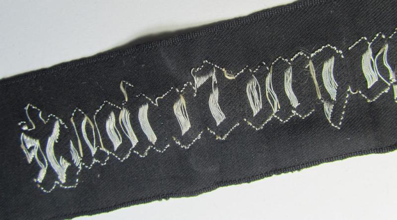 This is a very attractive - and actually rarely encountered! - so-called: WH (Heeres) related cuff-title (ie. 'Ärmelstreifen') being a typical (full-length!) black-coloured- and linnen-based example showing the (neatly silver-toned- and 'flatwire'-woven!) text that reads: 'Propagandakompanie' and that comes in an overall very nice- (ie. I deem clearly issued- and just moderately used- ie. worn-), condition. This example - having a total size of 41 cms. and having a width of 4 cms. as more often seen - is constructed from black-coloured linnen and shows the neatly (interwoven) text: 'Propagandakompanie' which is executed in a technique similar to the 'BeVo'-flatwire-weave pattern (as can be seen on the pictures). The piece is very nicely made and shows only minimal wear, storage-age and/or staining (as can be seen on the pictures). The exact usage for this armband has still to be fully determined: it was most likely introduced around September 1942 and was presumably merely intended for usage by staff-members (ie. officers) serving within the staff (ie. 'Stab') of the: 'Propaganda'-companies. This example originates from a private-household in Germany where it was recently uncovered: it was never before in collectors-hands. Simply a very attractive - and mosy certainly desirable! - WH (Heeres) related (and very nicely executed!) cuff-title that is - I deem - accordingly priced: only the first such rare item I ever had on offer!