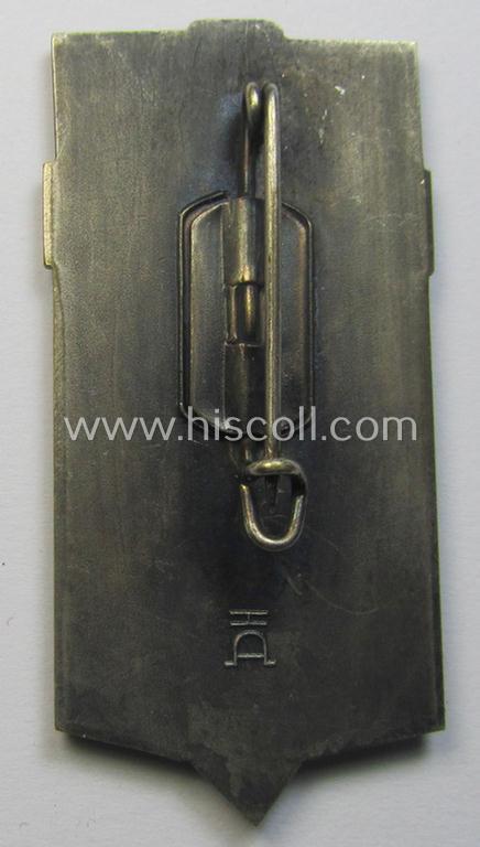 This is a truly attractive - and actually not that easily encountered! - early-period, HJ- ('Hitlerjugend') (ie. N.S.D.A.P.-) related day-badge (ie. 'tinnie' or: 'Veranstalstungsabzeichen') that was issued to commemorate the: 'I. N.S.-Reichsjugendtag 1932' held in the town of Nürnberg, being a neatly maker- (ie. 'H. Aurich'-) marked example that comes in an overall very nice- (albeit I deem just moderately used- ie. worn-), condition. The very detailed and/or pronounced badge - which is executed in typical, silverish-grey-toned metal (I deem so-called: 'Buntmetall'!) - truly shows extraordinary detail and was almost certainly never cleaned nor polished: it is still somewhat tarnished by age. The crest-shaped piece (which is as stated above neatly maker-marked with the 'HA'-logo on its back) depicts a downward-positioned sword-illustration with swastika with above that the (superimposed) text that reads: 'I. N.S.-Reichsjugendtag 1932' and comes mounted onto its (of course still functional) pin-/catch set-up (as can be seen on the pictures). Simply a very nice - and most certainly not that often encountered and/or truly early-period! - HJ- ('Hitlerjugend') (ie. N.S.D.A.P.-) related 'tinnie'. I deem that I have priced this attractive, 'Buntmetall'-based example according to its desirability and/or truly nicely preserved- and/or untouched condition!